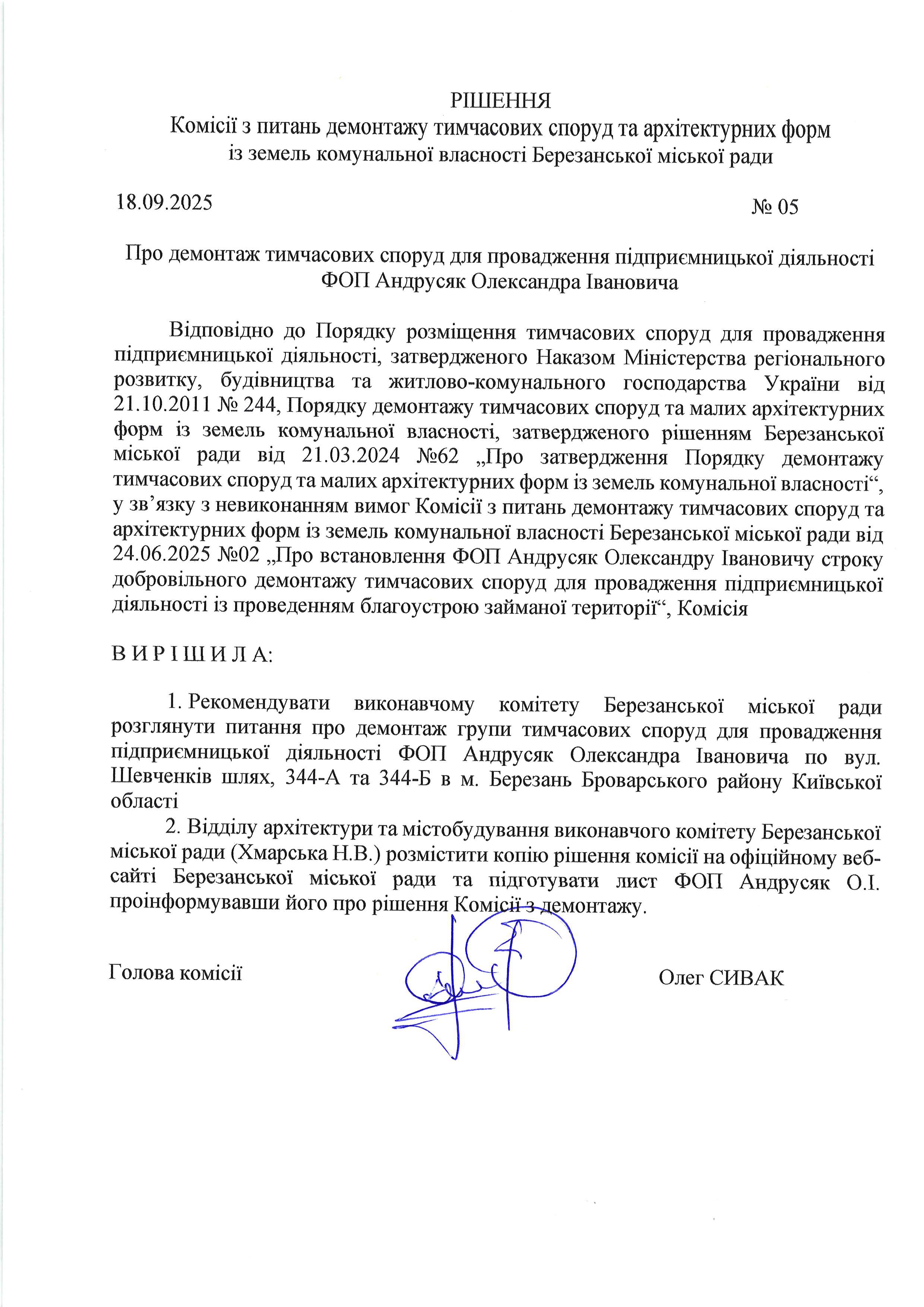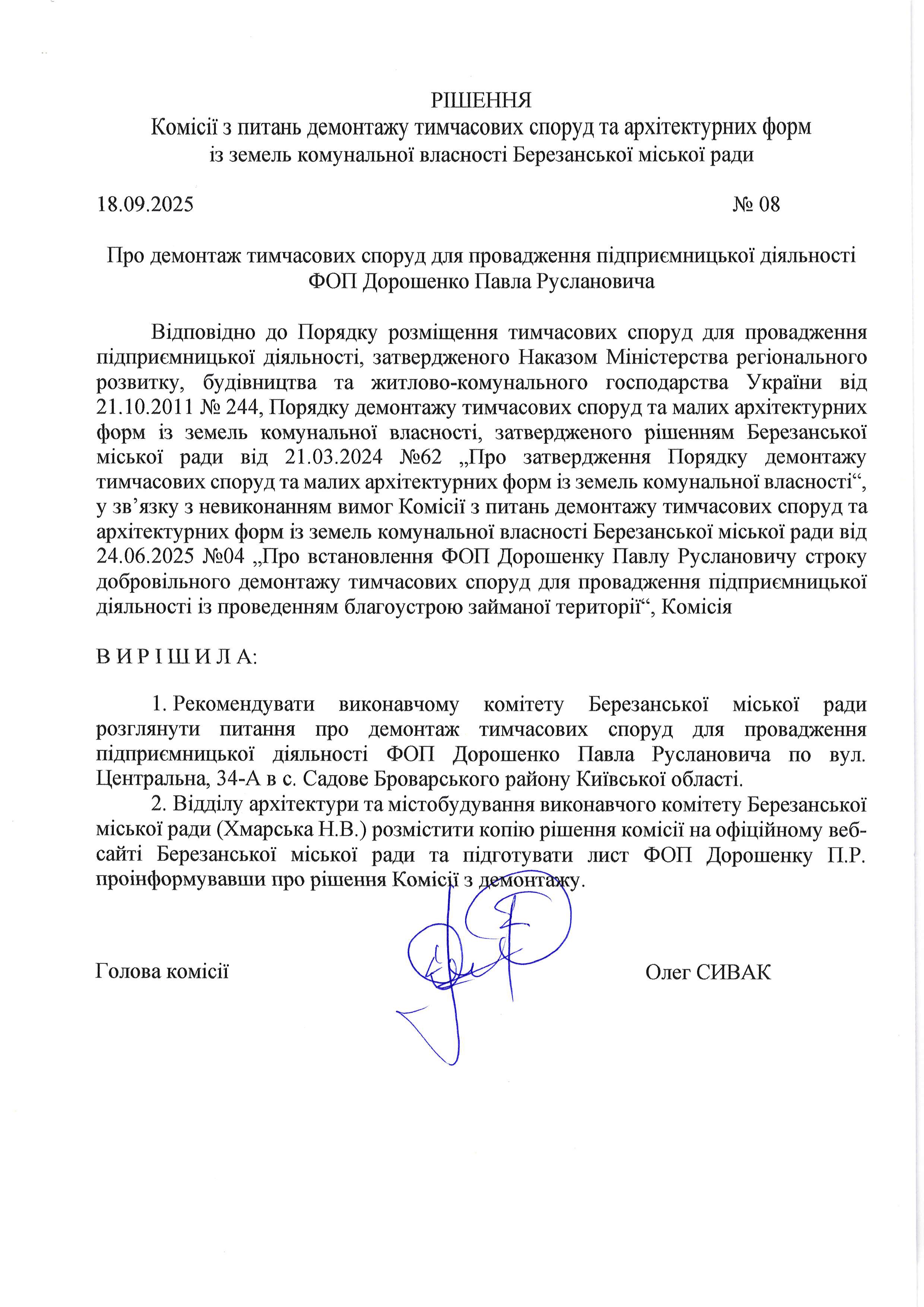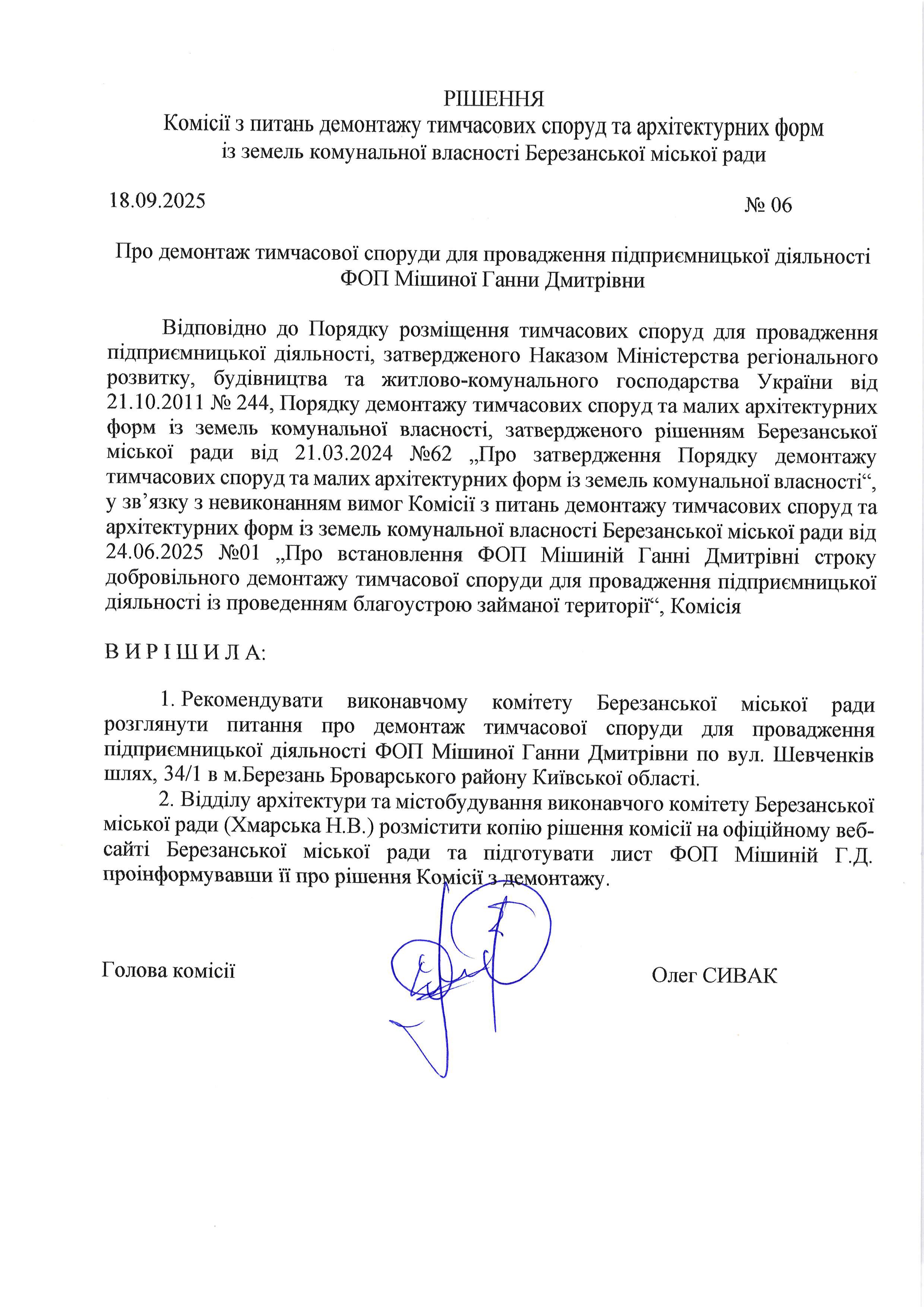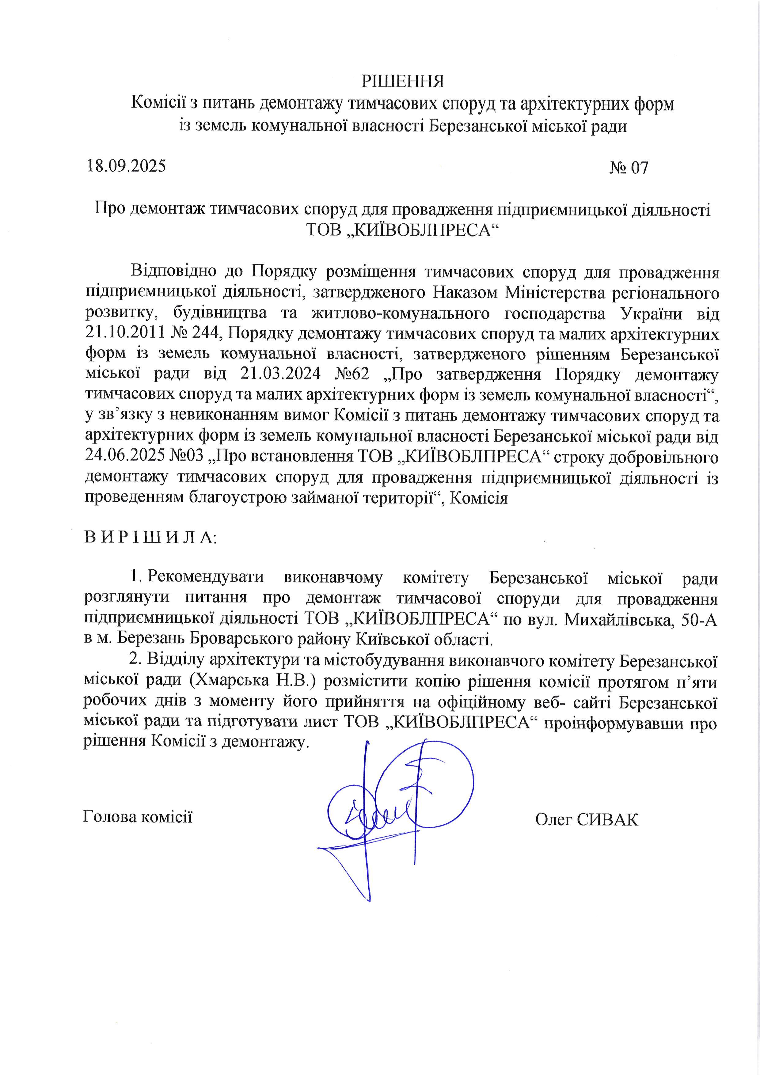 18.09.2025 на засіданні постійної комісії з питань демонтажу тимчасових споруд та малих архітектурних форм із земель комунальної власності Березанської міської ради було розглянуто питання демонтажу тимчасових споруд для провадження підприємницької діяльності, які розташовані із порушенням законодавства. Рішеннями комісії рекомендовано винести питання про демонтаж споруд за розгляд виконавчого комітету Березанської міської ради.